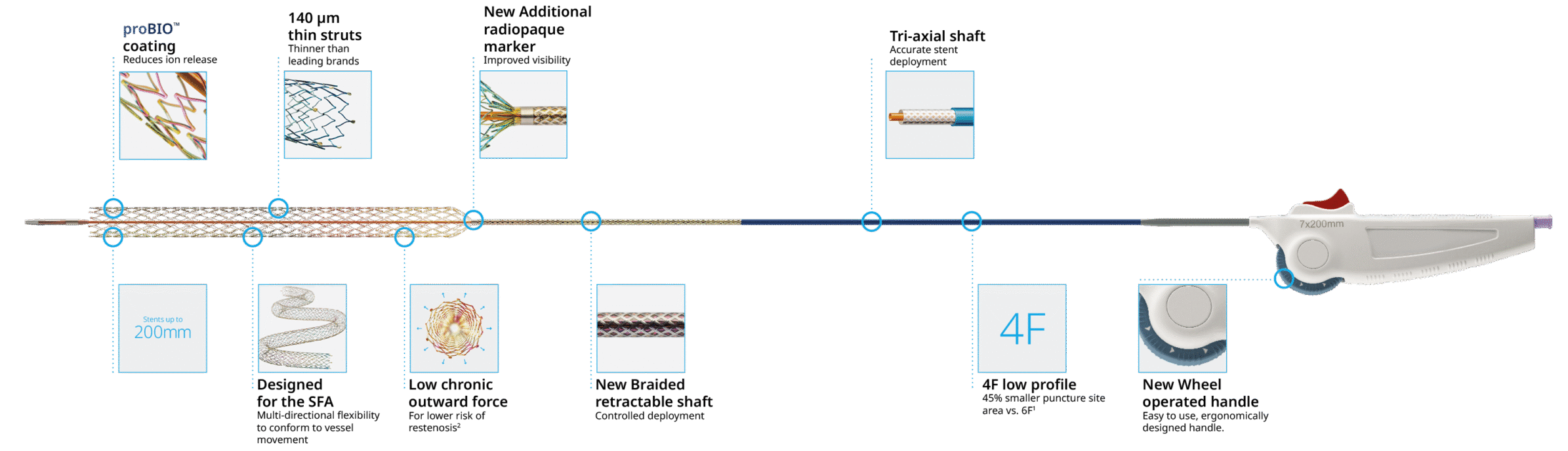 The first tri-axial, 4F thin-strut stent system for the treatment of lower limb peripheral arterial disease.