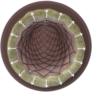 Chronic Outward Force (COF) is the force exerted on the vessel wall by a self-expanding stent to achieve its present diameter.11 Thinner struts, which have lower COF, result in a lower risk of restenosis, reduced vessel injury and inflammation and faster endothelialization.8,12,13